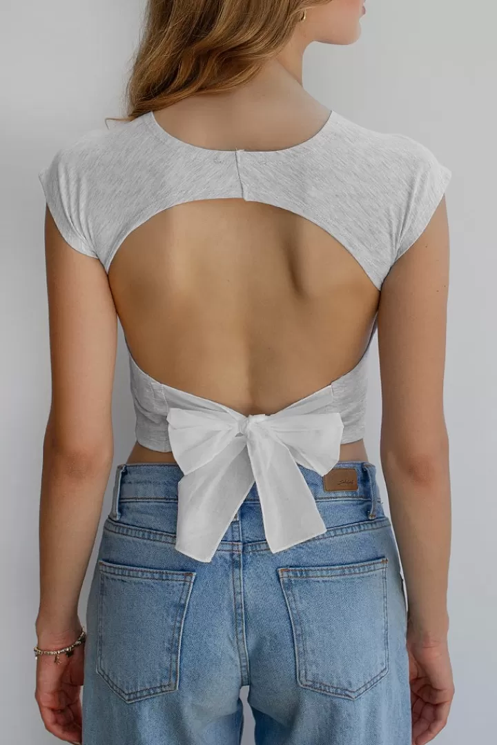 Crew neckline t-shirt, open back with bow, short sleeves, regular length, tight fit.