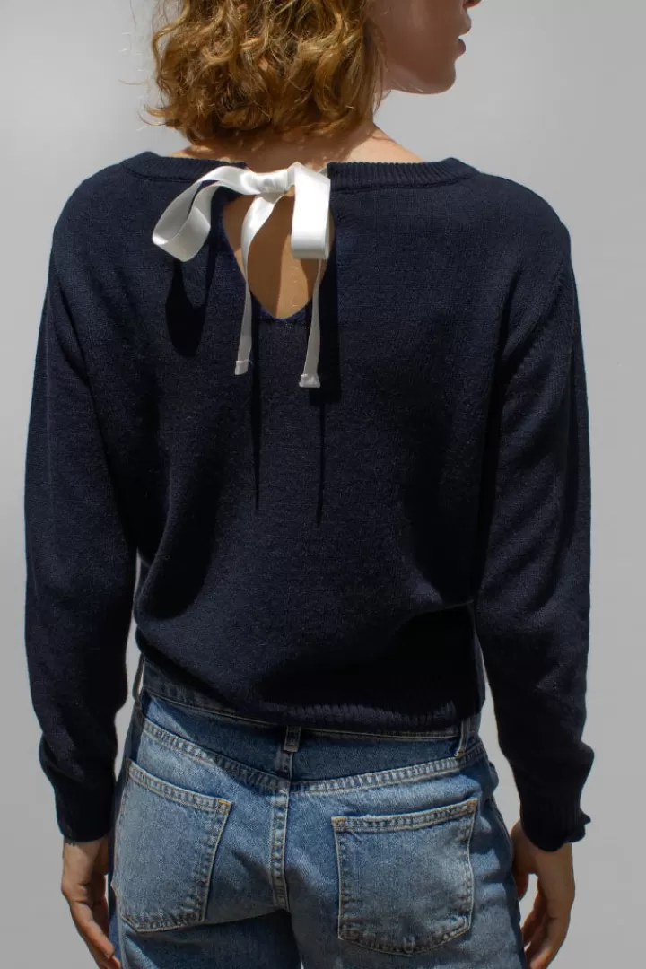 Sweater with bow on the back, crew neckline, long sleeves, ribbed hem, regular length, relaxed fit.