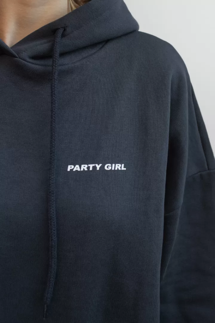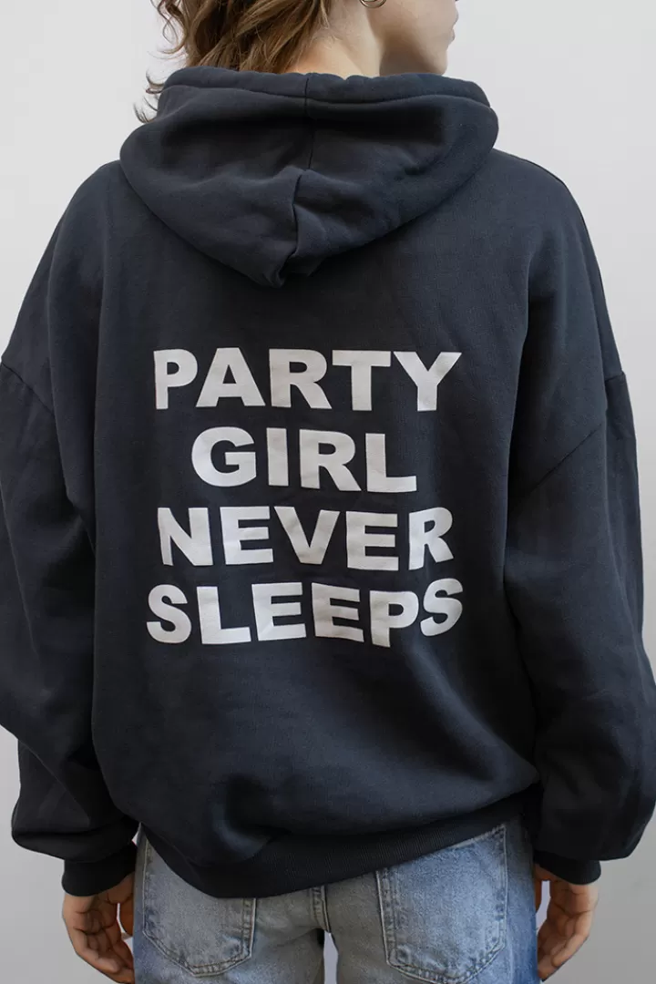 Hoodie with Party girl never sleeps print, front pockets, long sleeves, long length, relaxed fit.