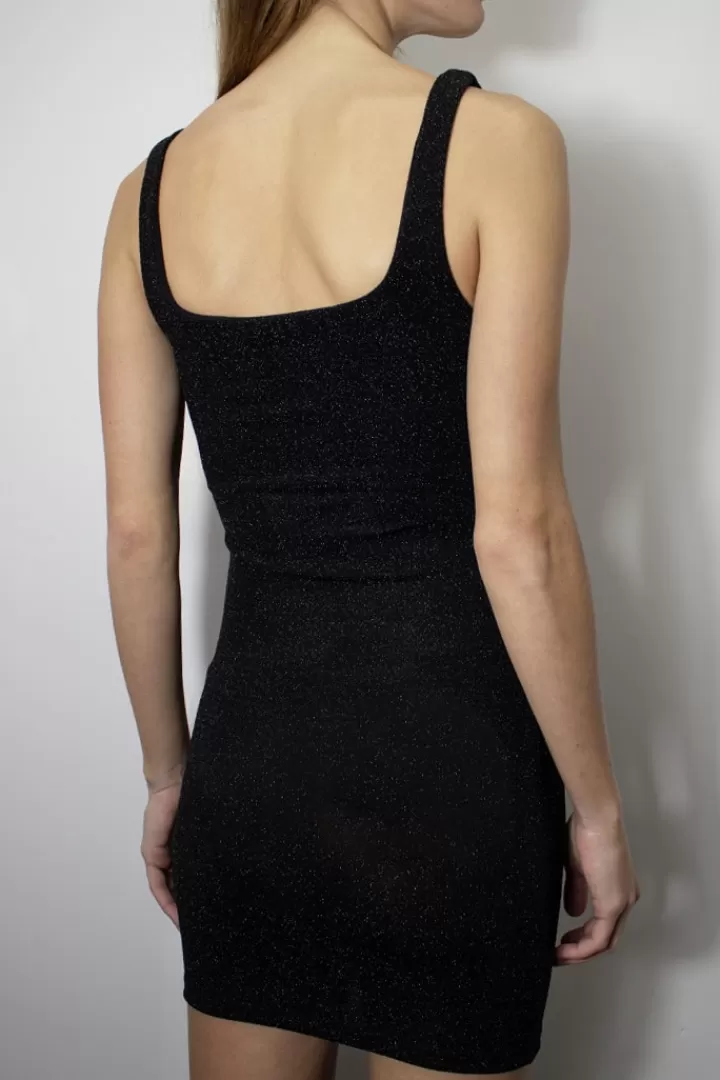 Tube dress, lurex fabric, square neckline, sleveless, short length, slim fit.