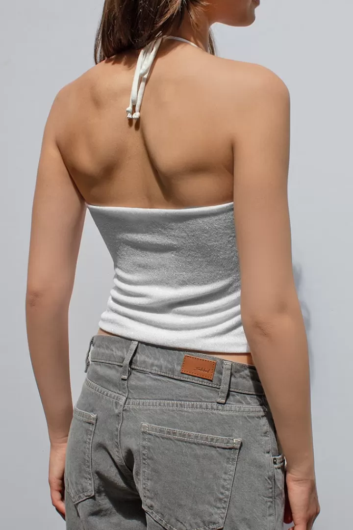 V-neck top, sleeveless, back tie fastening, regular length, slim fit.